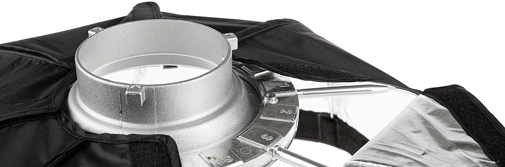 Bez vnitřního deflektoru a s oběma difuzními plochami jej lze používat jako klasický softbox s měkkým rozptylem světla. Po sejmutí difuzorů a nasazení deflektoru docílíte efektu podobného klasickému beauty dishi – kontrastního světla s jemnými přechody stínů. Kombinací difuzorů, deflektoru a přiložené voštiny (3×3 cm) můžete přesně tvarovat světlo podle potřeby.