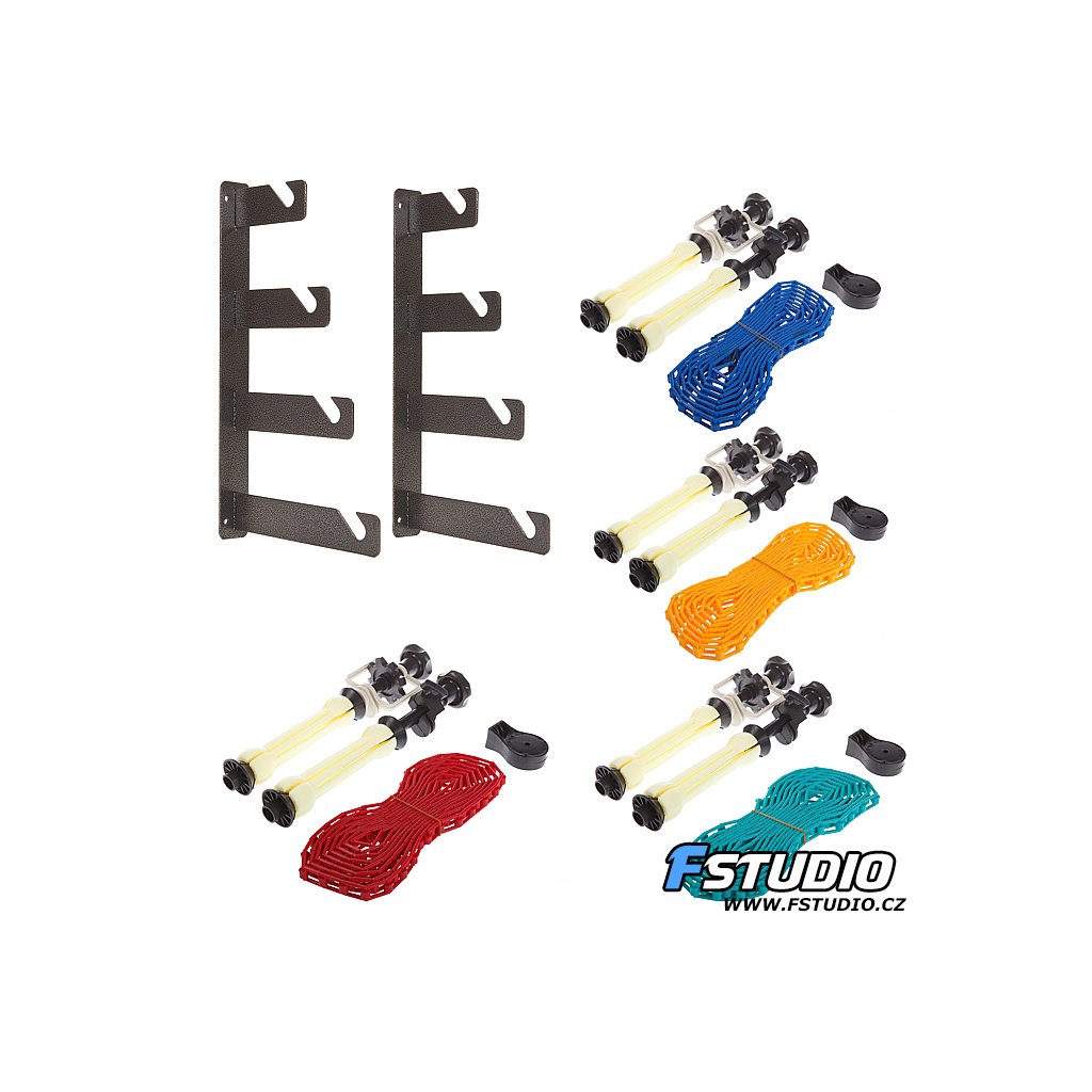 Kovové držáky-háky se upevňují na zeď nebo strop odpovídajícími hmoždinkami (v balení dostanete ty do betonu). Zajišťují pevné a bezpečné uchycení. Systém šetří místo a udržuje pozadí vždy připravené k použití.