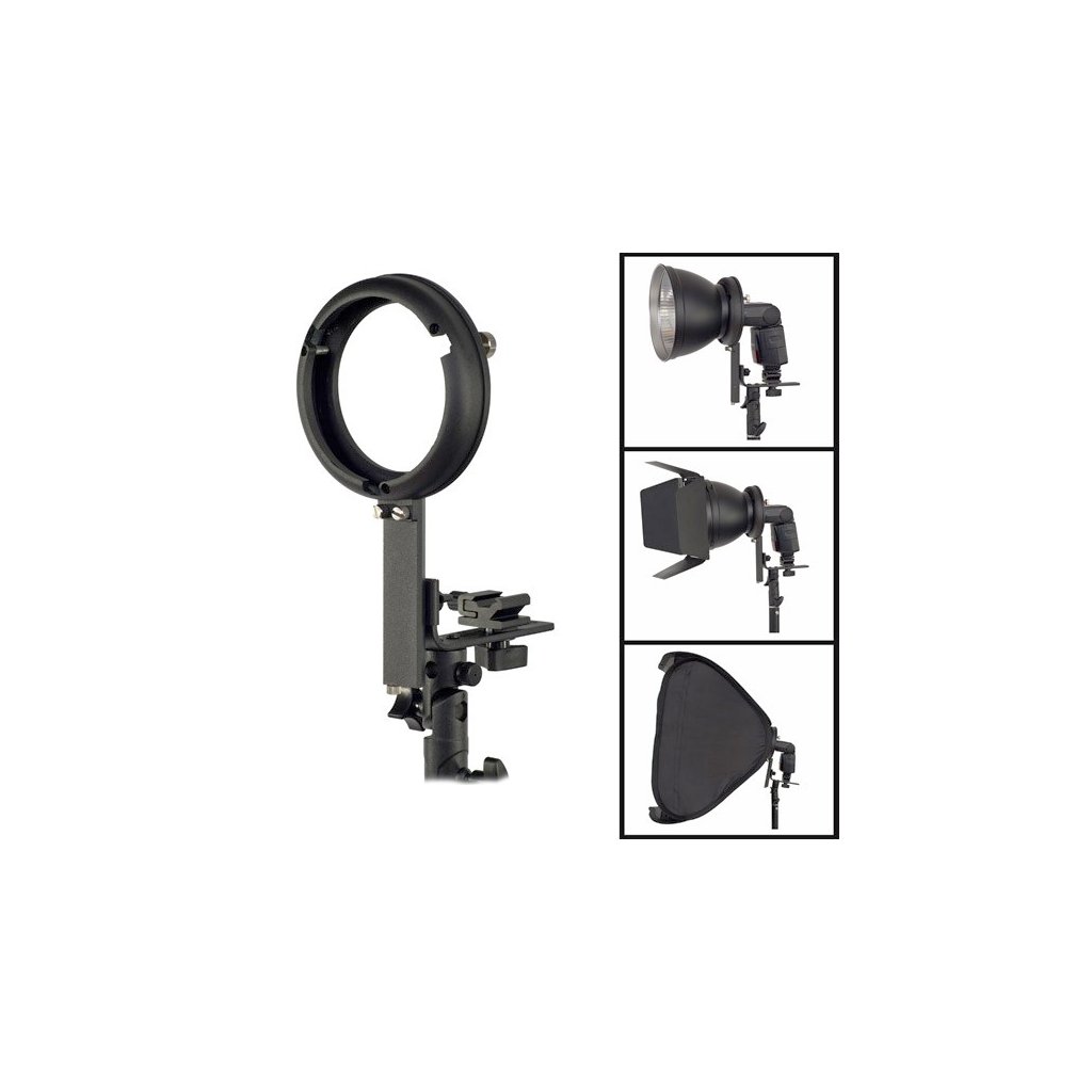 Adaptér pro uchycení libovolného systémového (externího) blesku a příslušenství s bajonetem Bowens (softboxy, reflektory, komínky, ...). Snadno tak lze používat systémový blesk s příslušenstvím pro studiové blesky. Adaptér má také uchycení pro ateliérový deštník.Adaptér je polohovatelný. Výška bajonetu Bowens se dá upravit, stejně tak vzdálenost blesku od bajonetu je nastavitelná.Adaptér lze nasadit na libovolný studiový stativ a díky přiložené redukci taky na běžný foto-stativ. Celý komplet je dodávaný v praktické přepravní tašce.