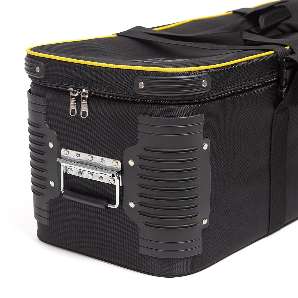 Taška poskytuje dostatečný prostor pro světelné hlavy, standardní reflektory, držáky, kabely a další komponenty, které běžně používáš při fotografování nebo natáčení videa. Pevný materiál a vyztužené rohy chrání techniku před prachem, nárazy a mechanickým opotřebením, a robustní zipy zajišťují bezpečné uzavření při přepravě i skladování. Taška je uvnitř vybavená 3 variabilními polstrovanými přepážkami na suchý zip.